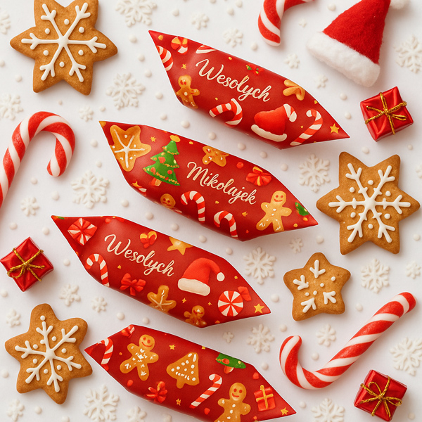 Wystarczy, że prześlesz nam logo, zdjęcie czy krótki tekst, a nasi graficy stworzą opakowanie, które wprowadzi świąteczny klimat i sprawi, że Twoje słodycze będą wyglądać równie wyjątkowo, jak smakują.